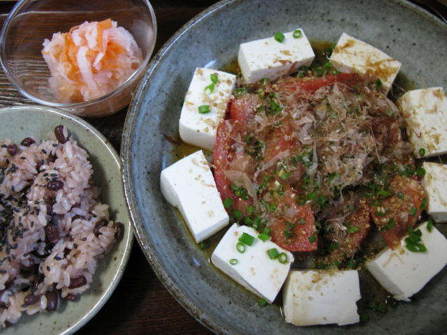 お豆腐とトマトのサラダに小豆おこわ、そして酢のものです。