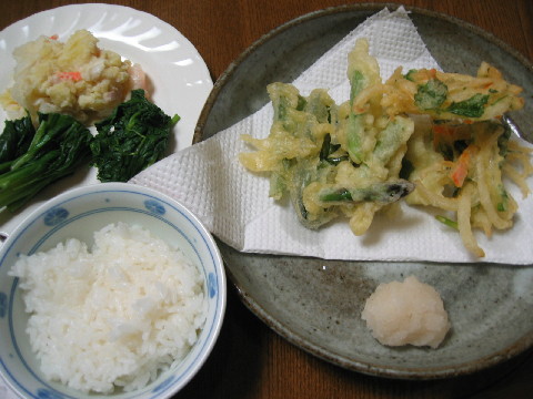 昨日から今日の午後まで夫の実家で過ごしてご飯もいただいてきました。 おいしかったな。 さて、野菜をたくさん貰ってきました。 今日の食材は全て夫の実家からいただいたもの。 もぎたて・とれたて野菜は新鮮でおいしい♪ ◆天ぷら(アスパラ・行者ニンニク・三つ葉入りかき揚げ) 大根おろし ◆ポテトサラダ ◆三つ葉のおひたし ◆行者ニンニクのわさび醤油漬け ◆白米