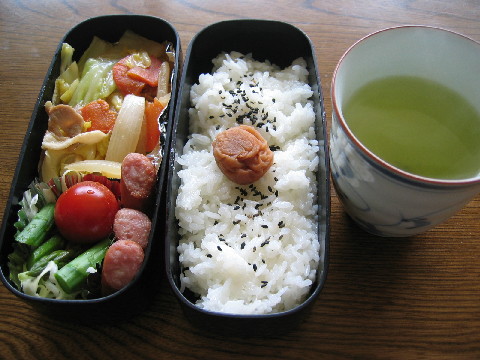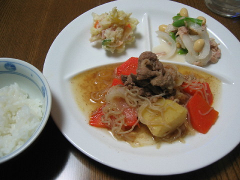 今日のお弁当 野菜炒めです。 ◆野菜炒め ◆ウインナー ◆プチトマト・グリーンアスパラ・キャベツ ◆白米・黒ゴマ・梅干し・お茶 晩ごはん 肉じゃがにしました。 地元産の牛肉です。おいしい♪ 副菜は2種類のサラダを作りました。 ◆肉じゃが ◆ポテトサラダ ◆玉ねぎ・アスパラ・大豆・シーチキンの黒酢サラダ ◆白米