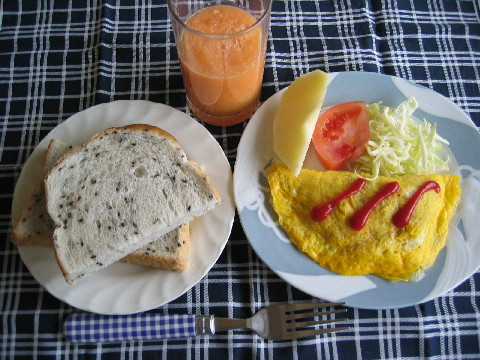 日曜日の朝はちょっと遅めの朝食。 この日も8時半に食べました。 ◆オムレツ キャベツの千切り トマト リンゴ ◆セサミパン ◆人参とリンゴのスムージー 夕食 スープカレー 写真を撮るのを忘れてしまいました。 明日は夫が飲み会のため昼も夜も作りません♪ うふふ。
