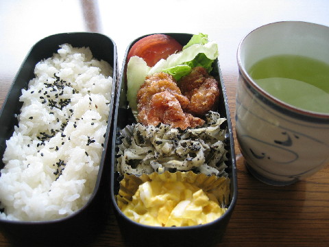 今週も一週間頑張らねば! 今日のお弁当 ◆唐揚げ レタス トマト ◆キャベツの胡麻和え ◆タマゴサラダ ◆白米 黒ゴマ ◆玄米茶 晩ごはん あっさり和食のごはん。野菜がもう少しほしいところ。 ◆にしんの塩焼き 大根おろし キャベツ ◆焼き茄子 ◆納豆(ネギ入り) ◆白米