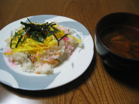 今日はお雛様、わが家もちらし寿司を作ってみました。 ◆ちらし寿司 ◆お吸い物(干しシイタケのだし+きわみ) きわみで味付けしたお吸い物は、本当においしかったです。 一番食品の「きわみ」は何にでもあう万能調味料です。 最近わがやではかかせない調味料となりつつあります。
