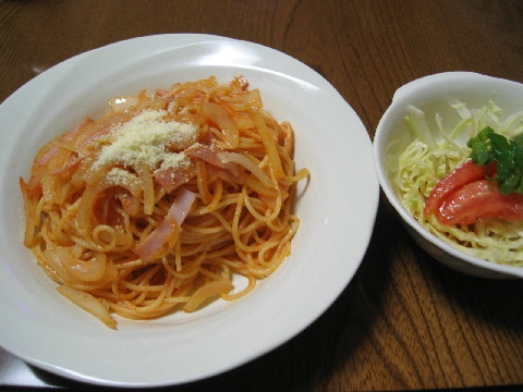 強風で外に行くのが嫌で、家にあるものを食べました。 こういう時はパスタが役立ちます。 でも、ナポリタンしかできませんでした。 ◆スパゲッティナポリタン ◆ノンオイルサラダ