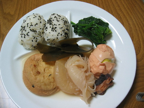 体調も徐々によくなり、昨日ようやくご飯を作ることができました。 やっぱり自分で作るご飯が一番おいしい。 晩ごはん おでんは昆布だしで煮込むと美味しさが倍増します。 タコの色がタマゴやガンモにうつってしまい、赤くなってしまいました。 からしを付けていただきました。 ◆おでん(ガンモ・大根・シラタキ・タコ・タマゴ・結び昆布) ◆ホウレン草のおひたし(きわみで味付け) ◆ごま塩おにぎり