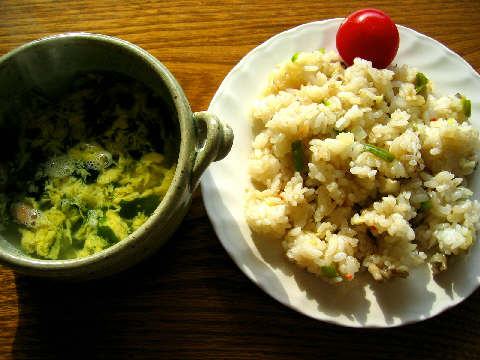 昨日の炒飯の残りと即席の玉子スープ。ひだまりの中お昼ごはん。