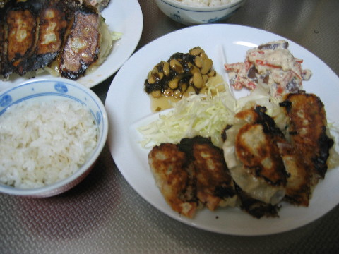 今日のメインは餃子ですが、最後に片栗粉を溶かして羽を付ける時に焦がしました。