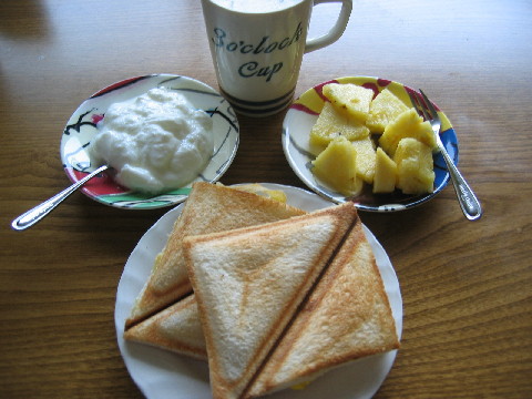 メニューは毎日決まっていて、パン・果物・ヨーグルト・ホットミルク・サラダ。