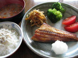 焼き魚 切干大根の煮物 茹でブロッコリー トマト