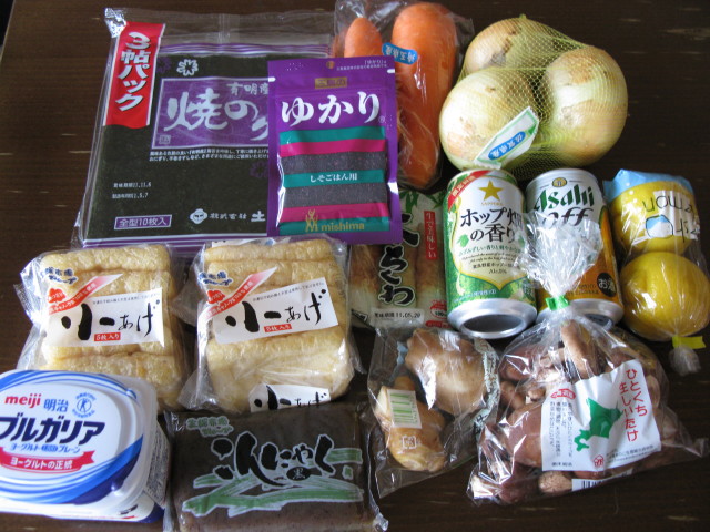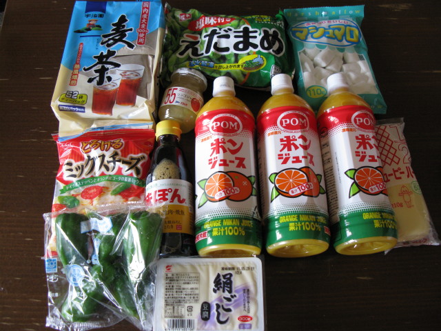 麦茶175円 マシュマロ118円 ピーマン58円 ミックスチーズ298円 ジャム165円 味ぽん195円 マヨネーズハーフ188円 豆腐58円 ポンジュース3本714円 玉ねぎ158円 人参178円 生姜138円 椎茸98円 ゆかり105円 レモン138円 ちくわ65円 小揚げ65円×2 こんにゃく75円 ヨーグルト138円 発泡酒2本212円