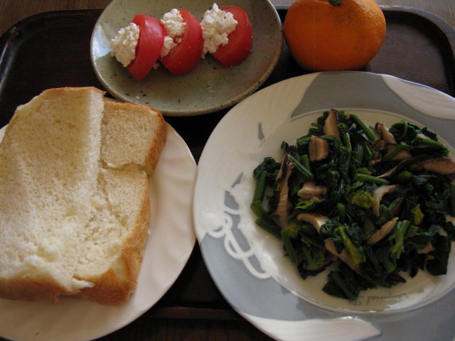 ホームベーカリーで作った焼きたてのパンとホウレン草と椎茸の炒め物です。