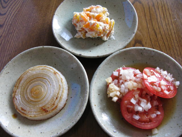 副菜はトマトと新玉ねぎのサラダ、新玉ねぎのステーキ、人参の白和えです。