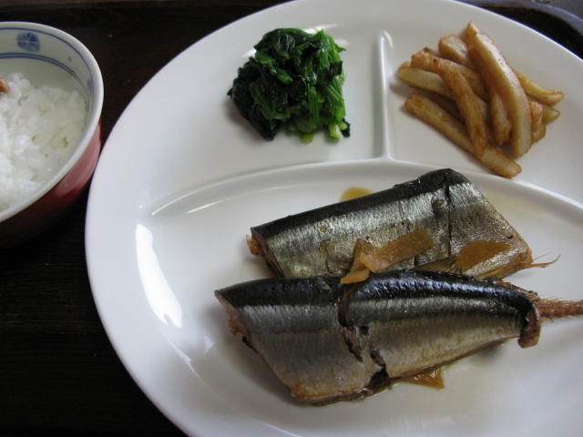 秋刀魚の煮付けは昨日の晩ごはんの残りですが、