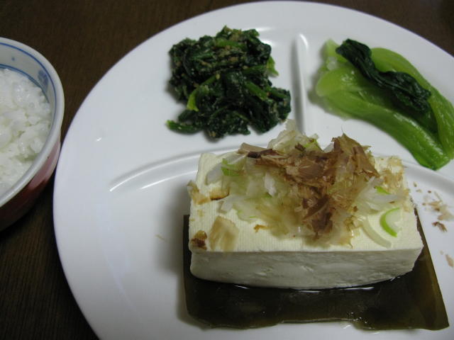 主菜は煮奴、副菜はほうれん草の胡麻和えと青梗菜のおひたしです。