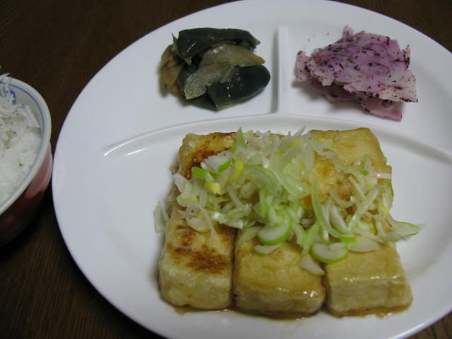 お昼も揚げ物だったので、フライパンで焼いて出汁を絡めネギをのせました。