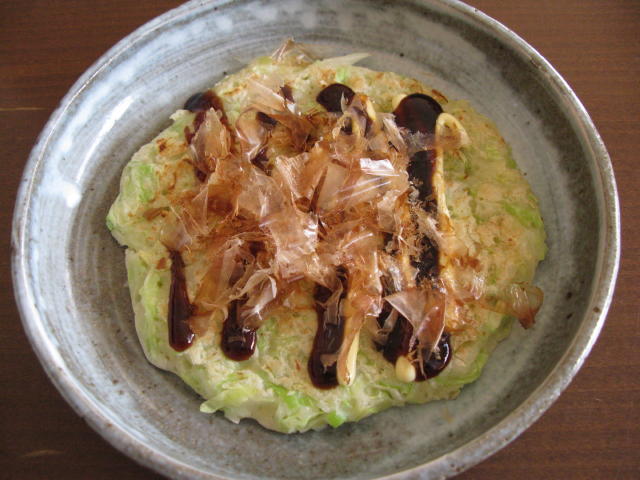 なんとなくお好み焼きが食べたくなり、小麦粉・長芋・出汁汁・塩・砂糖・ベーキングパウダー少々・キャベツを混ぜ合わて焼きました。