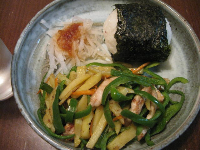 簡単に炒め物とおにぎり、大根サラダを作りました。