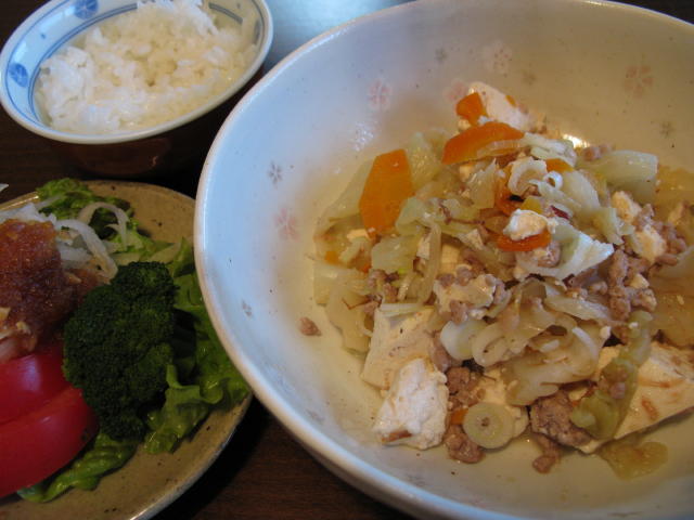 ご飯にはお豆腐と野菜いろいろのあんかけをかけました。
