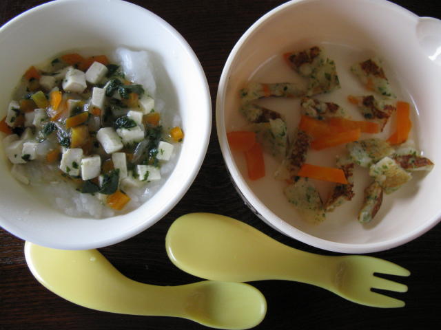 手づかみ用にはじゃが芋のパンケーキ風と人参の蒸したもの。