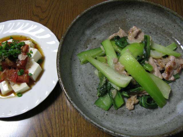 青梗菜と豚肉の炒め物と、お豆腐とトマトのサラダです。