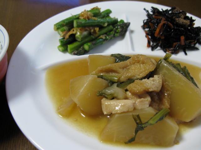 ◆かぶ&かぶの葉と鶏肉、油揚げの煮物 ひじきの煮物 アスパラのチーズ焼き 白米