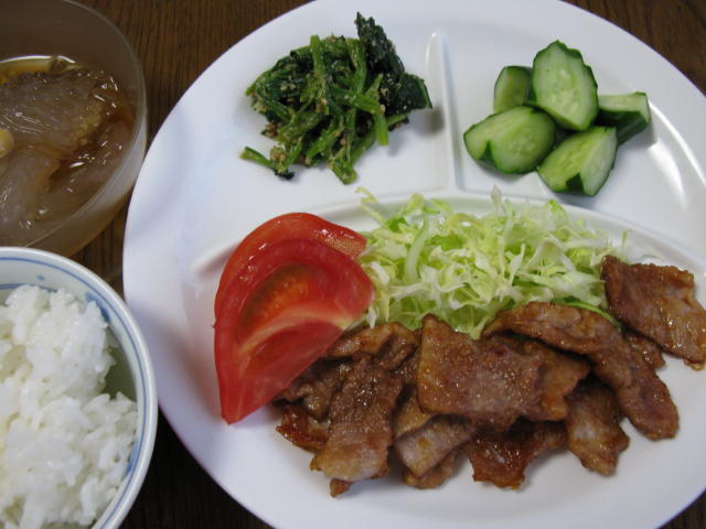◆生姜焼き キャベツの千切り トマト きゅうりのお漬物 ほうれん草の胡麻和え ところてん 白米