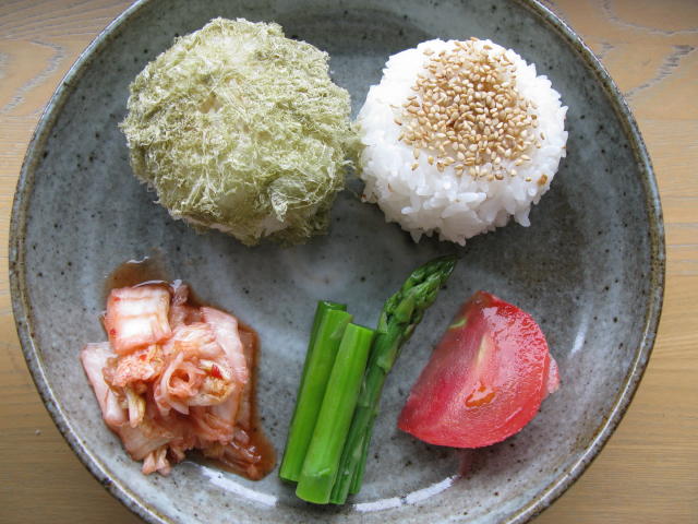 海苔がなかったのでとろろこんぶとゴマおにぎり。