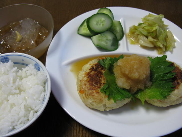 ◆お豆腐ハンバーグ キャベツの煮物 きゅうりのお漬物 ところてん 白米