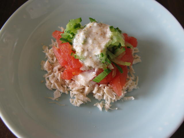 今日のお昼はバンバンジーサラダ。薄味でおいしですよ。