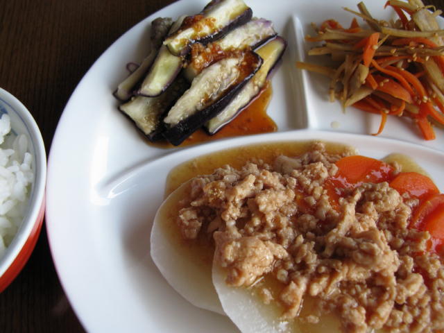 1品目はかぶと人参の鶏そぼろあんかけ。