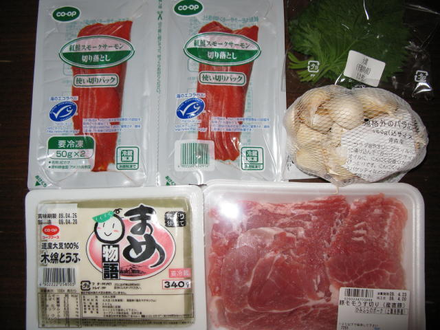 スモークサーモンでマリネを作りろうと思います。赤身の多い豚もも肉もたくさん使えそうです。青森産にんにくが1ネット298円なのがうれしい。