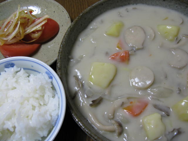 ◆きのこシチュー トマトと玉ねぎのサラダ 白米