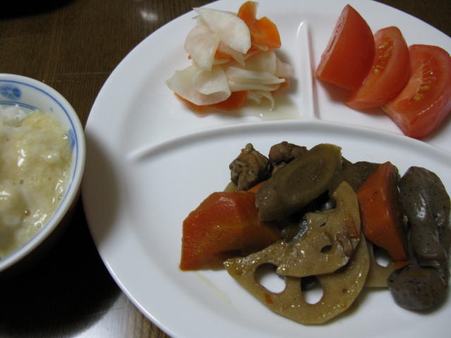 ◆筑前煮もどき トマト かぶとにんじんの酢の物 白米 とろろ芋
