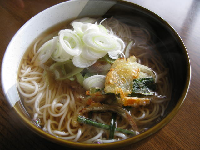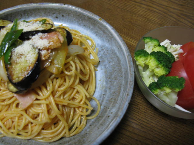 今日のお昼ごはん あたたかいそうめんです。 たっぷりのネギとかき揚げを入れていただきました。 かき揚げはたくさん作って冷凍しておきました。 ◆あたたかい素麺 晩ごはん お昼は麺類でしたが、晩ごはんも麺類です^^; 今日はベーコンと茄子のパスタです。 ◆茄子とベーコンのパスタ ノンオイルサラダ