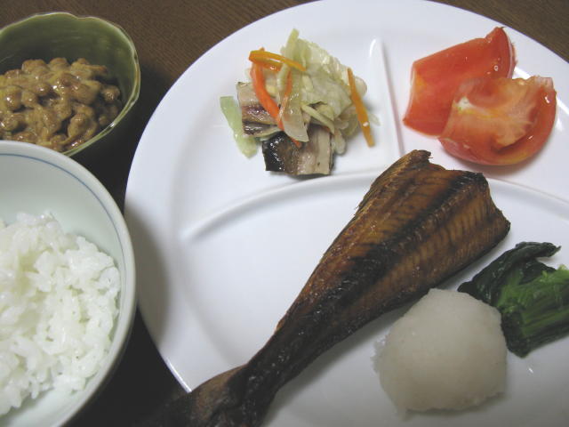 ◆ほっけ 大根おろし 小松菜のおひたし トマト ニシン漬け 納豆 白米