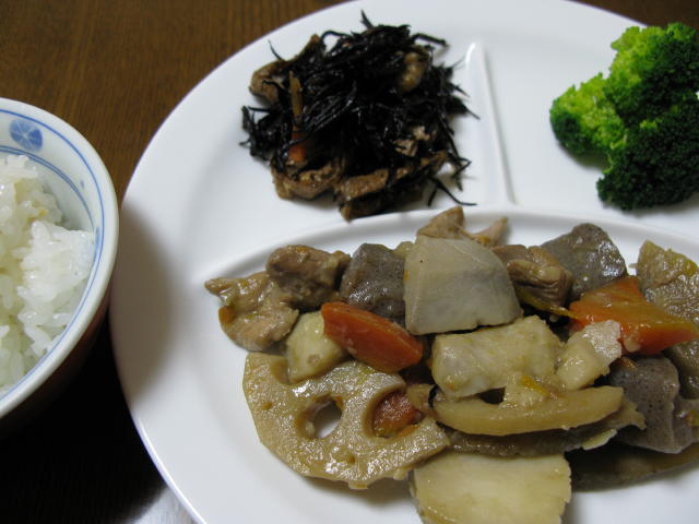 ◆根菜の煮物 五目ひじき ブロッコリー 白米