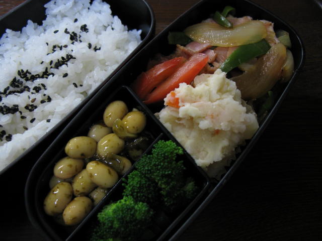 ◆野菜炒め ポテトサラダ トマト ブロッコリー 昆布豆 白米 黒ゴマ