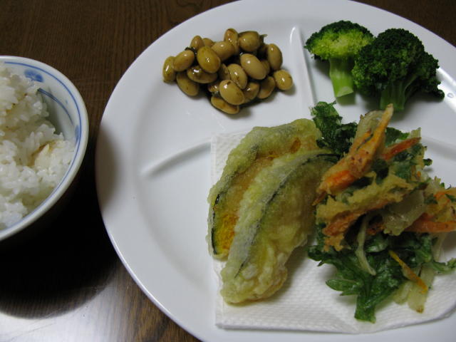 ◆天ぷら(かぼちゃ・春菊・玉ねぎ&人参) ブロッコリー 昆布豆 白米