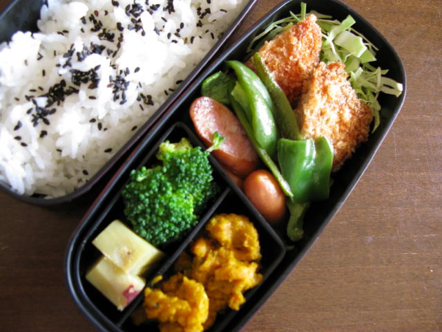 ◆鮭フライ 千切りキャベツ ウインナーとピーマンの炒め物 カボチャサラダ ブロッコリー サツマイモ 白米 黒ゴマ