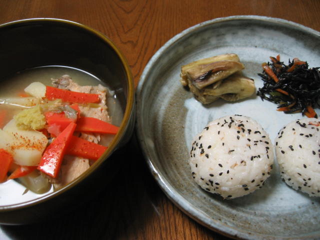 ◆鮭のあら汁 ゴマ塩おにぎり 焼き茄子 五目ひじき