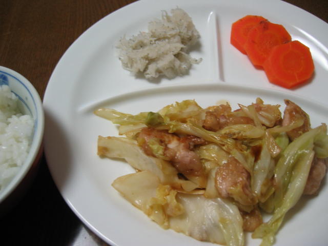◆キャベツと鶏肉の炒め物 人参の甘煮 しらすと大根おろし 白米