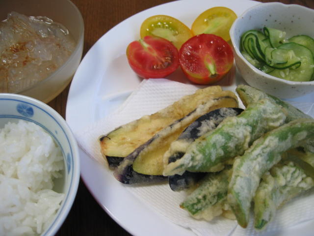 ◆野菜の天ぷら きゅうりの酢の物 トマト ところてん(母手作り) 白米