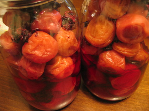 干した梅をもう一度赤梅酢に漬けてから保存瓶に移します。