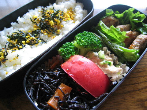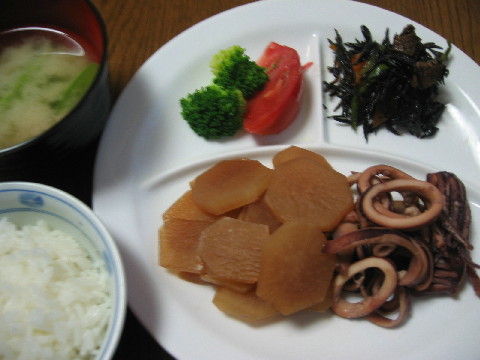 ◆イカと大根の煮物 五目ひじき ブロッコリー トマト えんどう豆のお味噌汁 白米