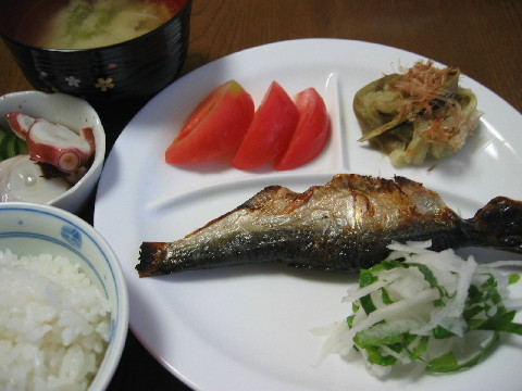 ◆にしんの塩焼き 大根とシソ 焼き茄子 トマト きゅうりとタコの酢の物 えんどう豆と人参のお味噌汁 白米