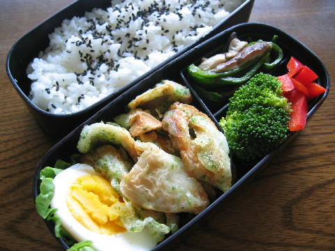 ◆ちくわの磯辺揚げ ゆでたまご レタス ピーマンと椎茸の炒め物 ブロッコリー パプリカ 白米 黒ゴマ