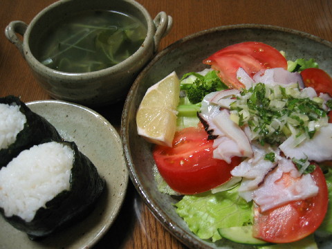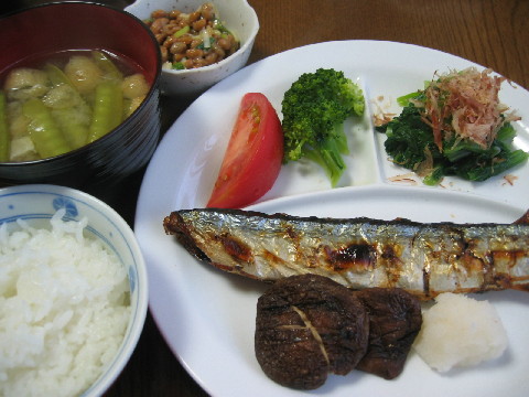 ◆秋刀魚の塩焼き 大根おろし 焼き椎茸 小松菜のおひたし ブロッコリー トマト えんどう豆と揚げのお味噌汁 納豆(ネギ・シソ入り) 白米