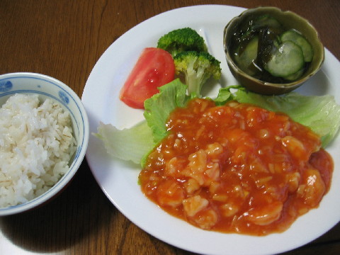 ◆えびチリ レタス きゅうりの酢の物 ブロッコリー トマト 麦入りごはん