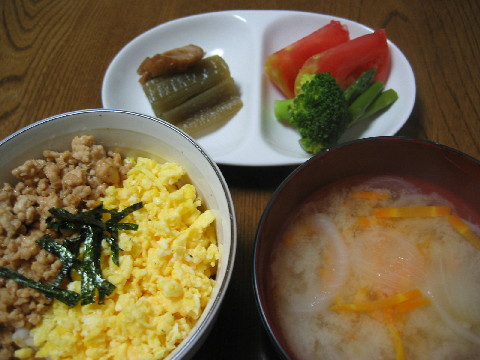 ◆2色丼 玉ねぎと人参のお味噌汁 ふきとちくわの煮物(朝の残り)