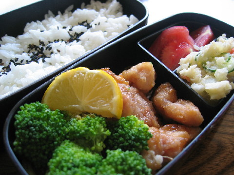 ◆鶏もも肉の照り焼き ブロッコリー レモン ポテトサラダ トマト 白米 黒ゴマ