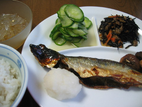 ◆ニシンの塩焼き 焼きしいたけ 大根おろし 五目ひじき きゅうりの酢の物